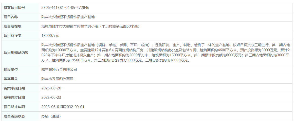 2025年6月23日,汕尾市陸豐大安駿婭不銹鋼飾品生產(chǎn)基地備案復(fù)核獲通過(guò)。