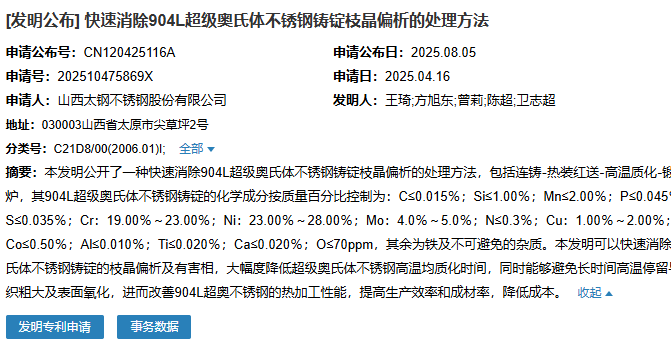 2025年8月5日,山西太鋼不銹鋼股份有限公司成功申請(qǐng)一項(xiàng)名為“速消除904L超級(jí)奧氏體不銹鋼鑄錠枝晶偏析的處理方法”專(zhuān)利,申請(qǐng)公布號(hào)為CN120425116,申請(qǐng)日期為2025年4月16日。