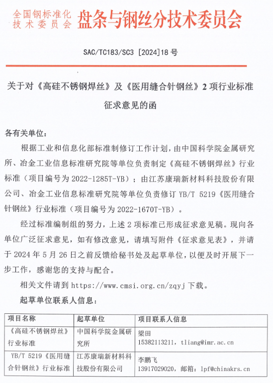 4月25日,由中國(guó)科學(xué)院金屬研究所、冶金工業(yè)信息標(biāo)準(zhǔn)研究院等單位負(fù)責(zé)制定《高硅不銹鋼焊絲》行業(yè)標(biāo)準(zhǔn)(項(xiàng)目編號(hào)為2022-1285T-YB)已形成征求意見稿。